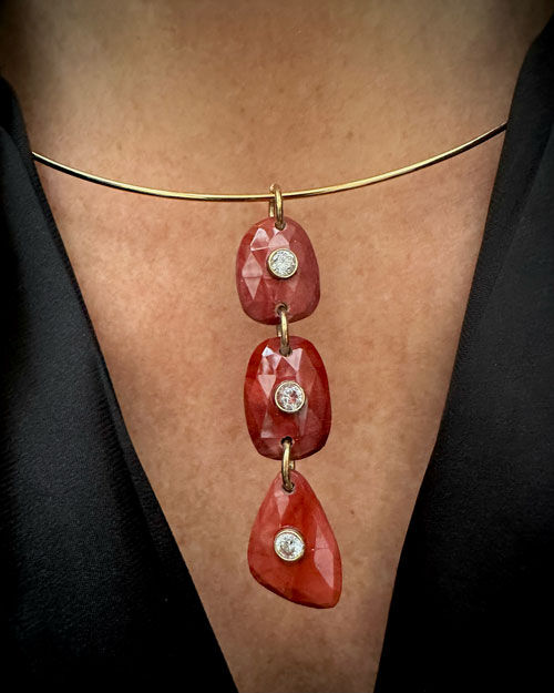 Cette collection est réalisée avec des cristaux bruts, polis ou taillés, qui grâce à une chaîne nous relient comme un élément à nos mémoires anciennes.