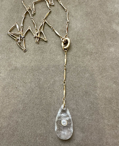 Cette collection est réalisée avec des cristaux bruts, polis ou taillés, qui grâce à une chaîne nous relient comme un élément à nos mémoires anciennes.